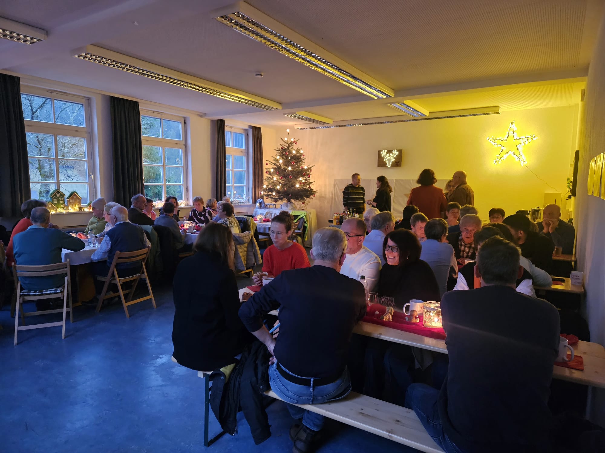 Dank der Bewirtungsmöglichkeiten im Schulhaus war man vom Regen weitgehend unabhängig. So waren beide Klassenzimmer im ersten und zweiten Stock gut gefüllt und boten bei Kaffee und Kuchen Raum für Begegnungen, Gespräche und genussvolle Pausen. Auch Glühwein, Kinderpunsch, rote Grillwürste und frische Waffeln fanden großen Anklang.